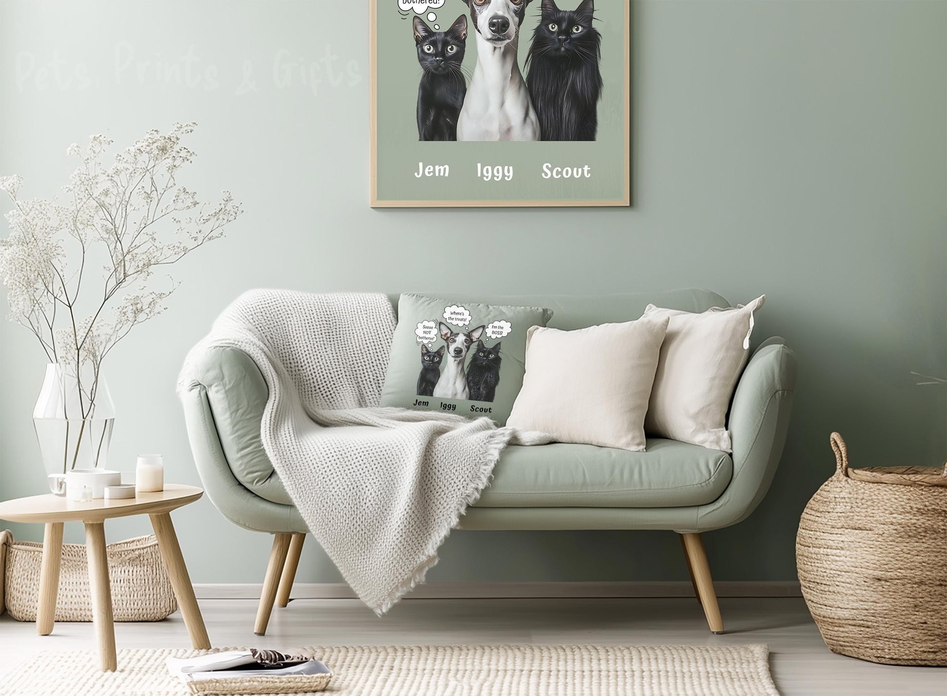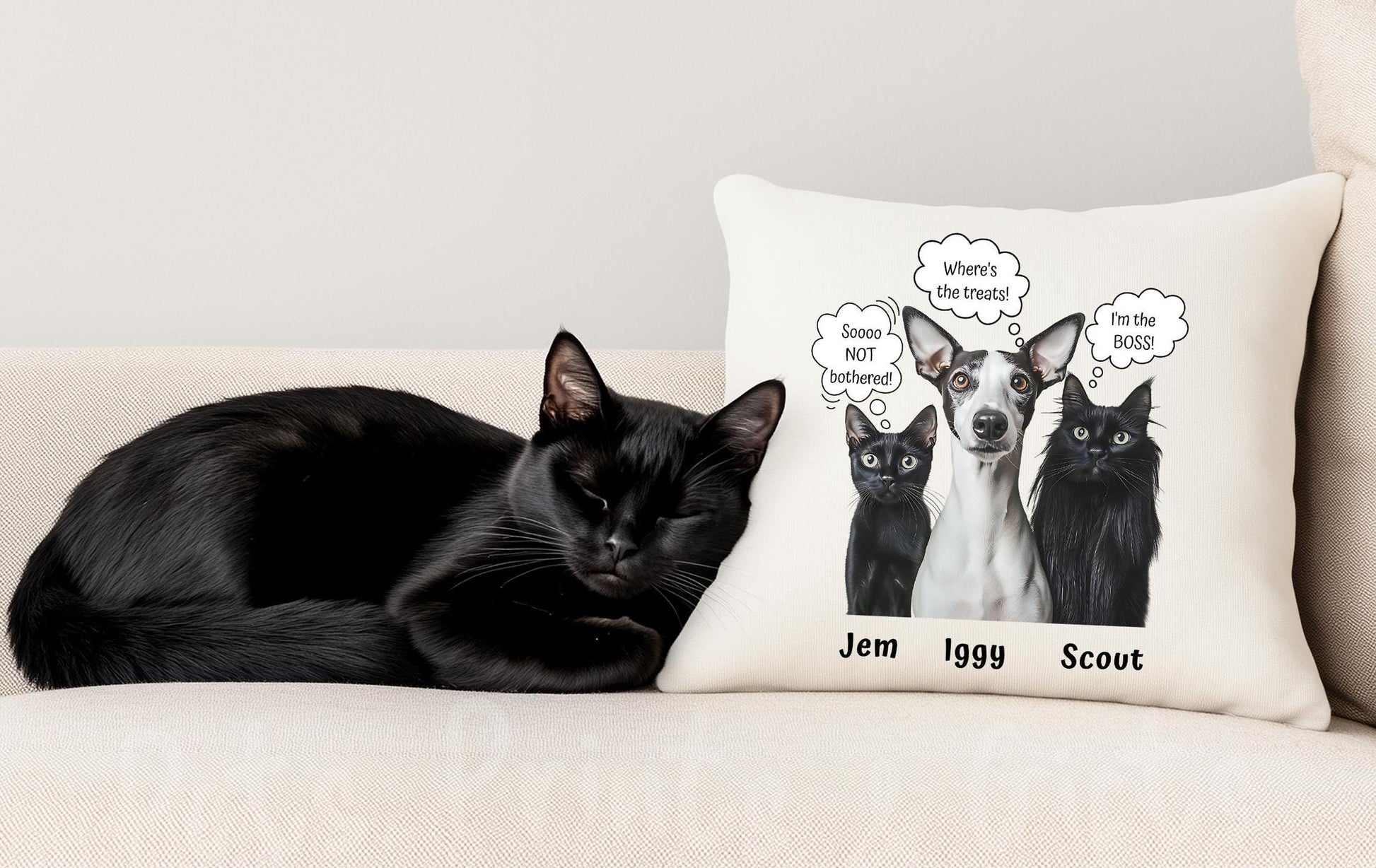 We can do any kind of pet or animal. Whether your pet is a bossy cat like Scout who is actually the boss in our home! or a daft dog like Iggy our whippet or even a mischievous aloof Cat like Jem (in the video) this pillow will showcase their personalities perfectly adding a personal touch to your home decor or a truly unique gift for Pet lovers, Dog Moms, Cat Dads, ideal for Birthdays, Christmas or pet lovers looking for a unique and sentimental gift. Whether it's a funny pet pillow for a friend or a memorial pet cushion to cherish a lost companion this personalized pillow will bring joy and comfort.