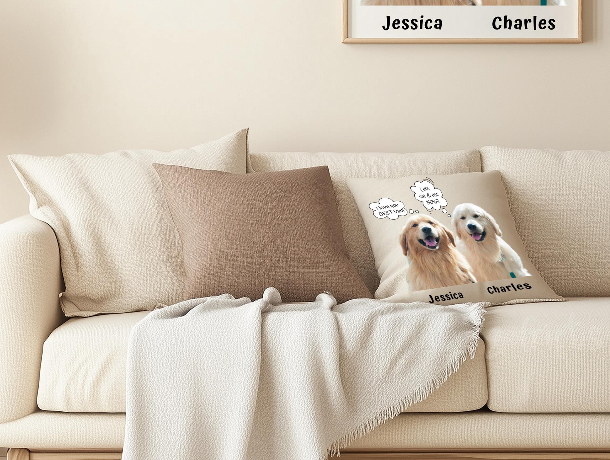 Celebrate the joy your pet brings to your life with our totally unique one of a kind Personalized Personality Pet Pillow! This custom Pet Cushion features your pet’s photo, your pets name and their unique quirky sweet or heartfelt customized thought capturing their personality in a fun and adorable way.