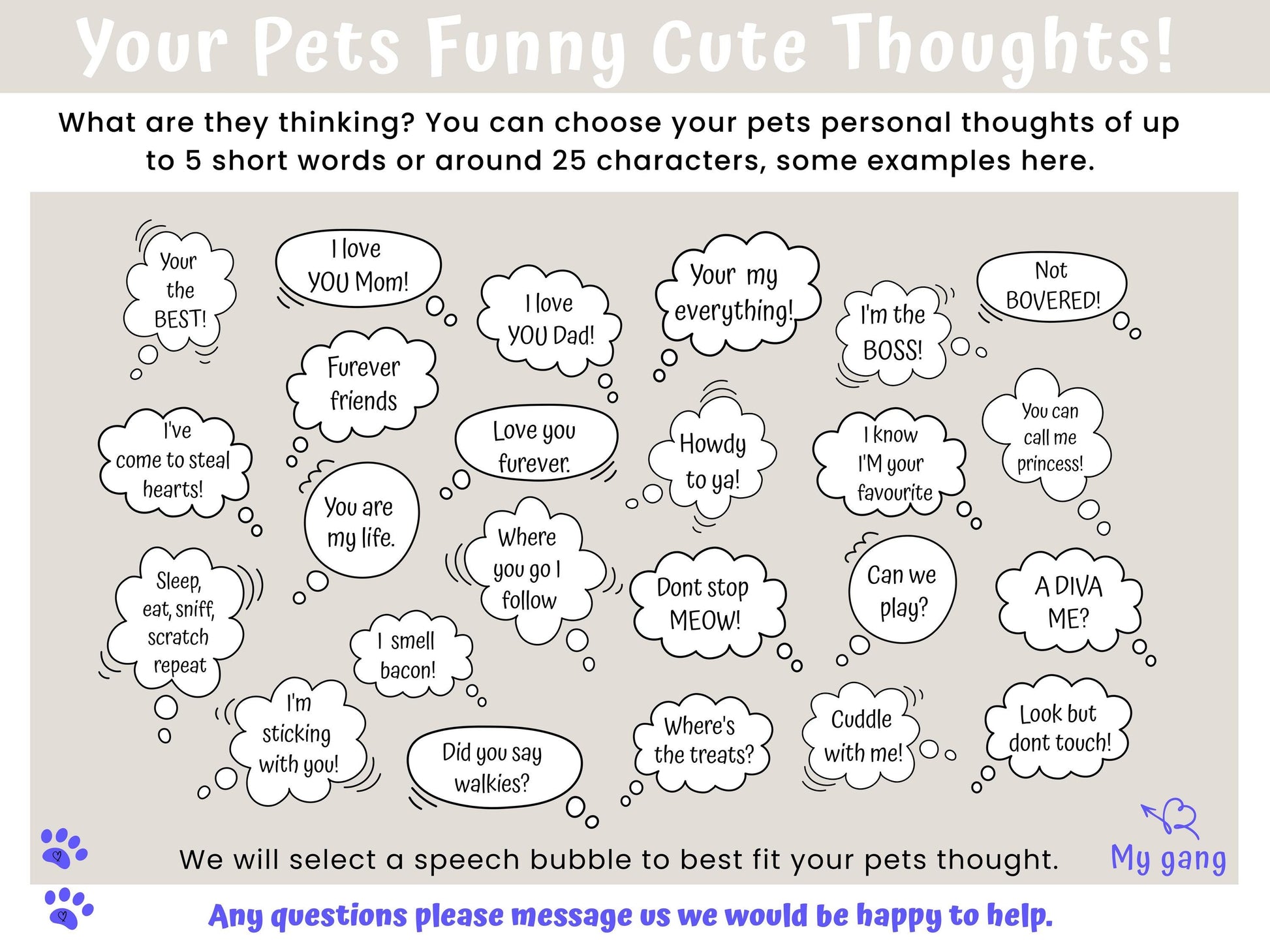 4. Please provide your pets thought up to 5 short words or 25 characters per pet. If more than one pet please name and describe each pet with their thoughts - ie black and white whippet called Iggy thinking ‘where’s the treats’